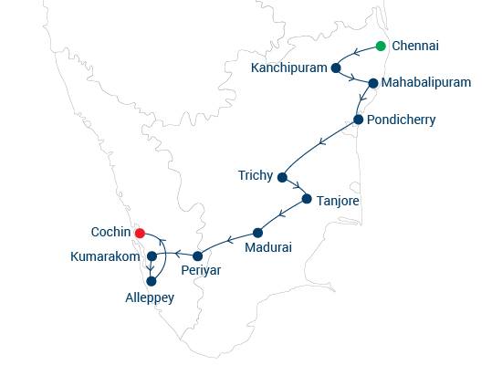 En esta odisea del sur de la India disfrute de un crucero nocturno en una casa flotante en Alleppey y descubra los encantos simples de los remansos escénicos. Pase tiempo en Periyar donde los elefantes salvajes vagan, disfrute de un retiro de spa Ayurveda, descubra la magnífica arquitectura de los templos en Madurai y Tanjore, explore los bungalows de comerciantes ricos en Karaikudi, admire los cientos de caballos de terracota en Ayyanar, enamorarese de la pintoresca ciudad francesa de Pondicherry y obtenga una lección de historia y seda en Chennai. Así que vengan, descubran el maravilloso mundo del sur de la India.